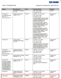 截止到目前已取得GRPU复材边框认证证书的单位有:正泰新能科技有限公司,横店集团东磁股份有限公司、常州亿晶光电科技有限公司、晶科能源股份有限公司等5家单位,这是组件客户以及第三方检测机构对我们GRPU复材边框的高度认可,接下来的我们会陆续获得超过15家组件认证客户,请大家拭目以待。